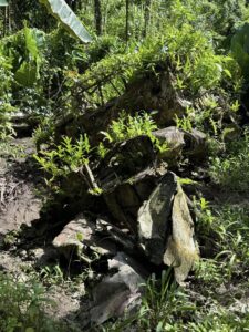 海軍の艦載機零戦52型の墜落残骸です。これも三菱重工製との。翼とコックピットがなんとか原型を留めており、国破れて山河ありと言いますか悲惨さを感じます。