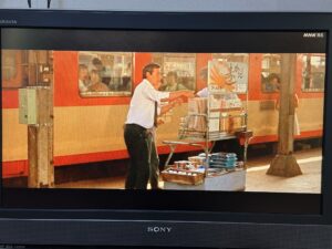 1枚目画像のとおり山陰地方に向かう列車は間違いなくキハ82系特急車両なのですが、丹波哲郎が途中駅で新聞を買うために駅に降りるシーンの2枚目、3枚目、そして社内でその新聞を読むシーンの4枚目画像を見ると外装色やボックス型シート等どう見てもキハ58系急行車両なのです。しかし2枚目画像のサボをよく見ると、「特急」および「まつかぜ」という表示が見れますし、区間サボも「大阪~博多」となっていて正しいです。